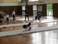 3年生の体育授業の様子です。マット運動を行っています。後転や側転などの練習に取り...