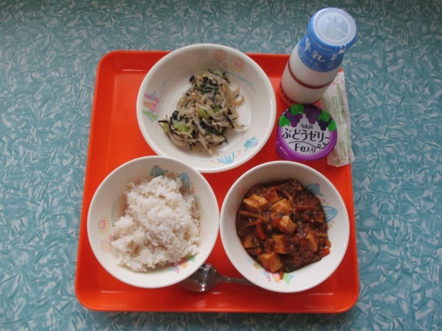 今日の給食は、麦ご飯・牛乳・マーボードウフ・ひじき入りバンバンジー・ぶどうゼリーです。