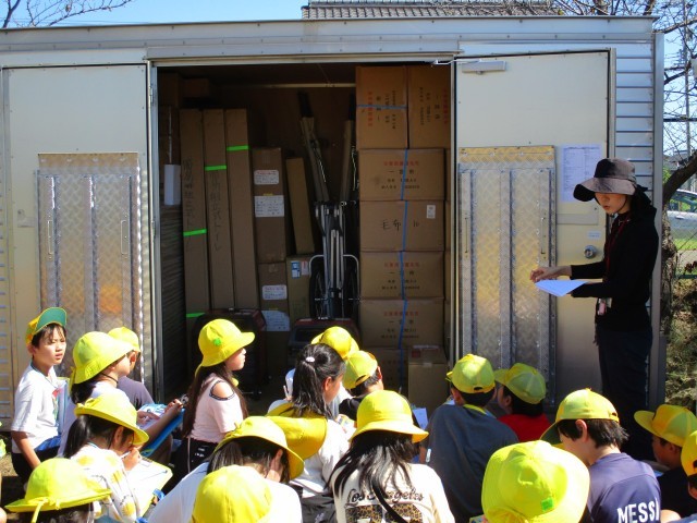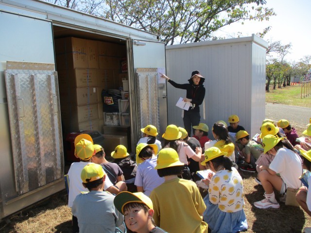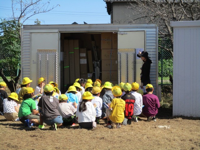 木曽川西小学校には防災備蓄倉庫があることを学習し、実際に倉庫のところへ行ってどんなものが備蓄されているのか見学しました。