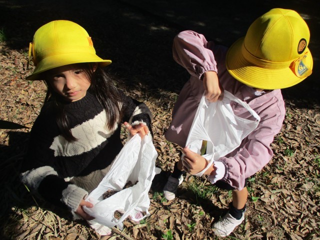 「こんなにたくさんとれた!」「こんなに大きなまつぼっくりがあった!」と、見つけたものを嬉しそうに見せ合う1年生。