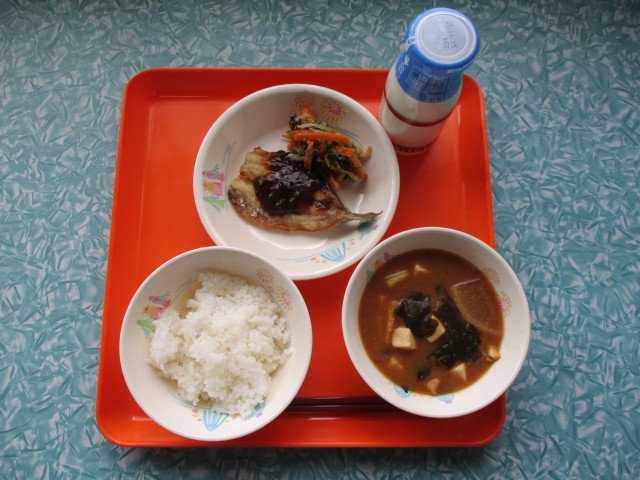 今日の給食は、ご飯・牛乳・いわしの香味だれ・ごま和え・さつまいものみそ汁です。
