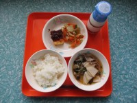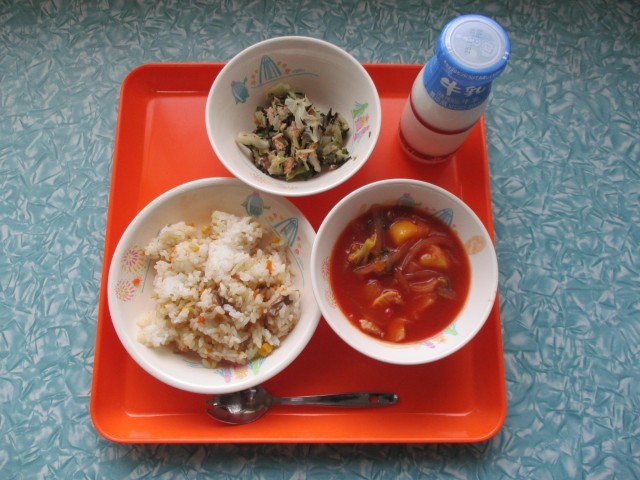 今日の給食は、鶏ごぼうピラフ・牛乳・ひじきサラダ・ニョッキのトマト煮です。