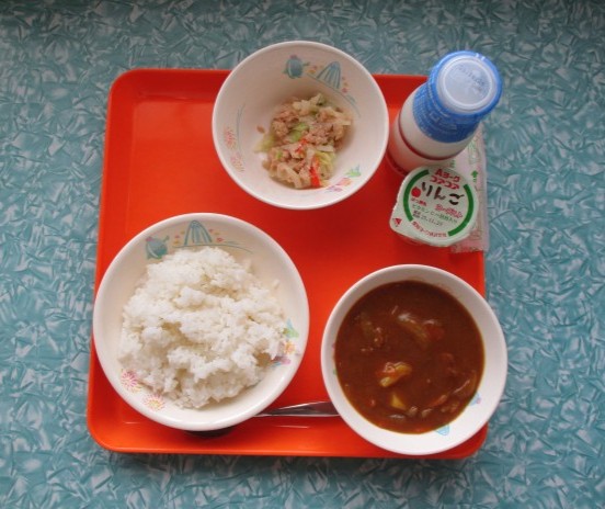 今日の給食は、ご飯・牛乳・ビーフカレー・だいこんサラダ・りんごヨーグルトです。