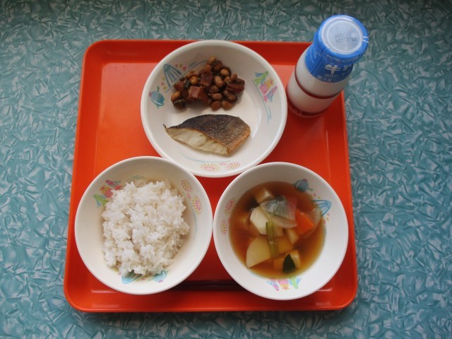 今日の献立は、麦ご飯・牛乳・ほっけの塩焼き・鉄火みそ・けんちん汁です。