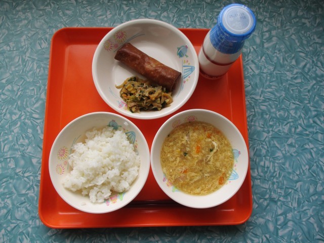 今日の給食は、ご飯・牛乳・愛知の野菜入り春巻き・切干しだいこんのキムチいため・うきうきエッグスープです。
