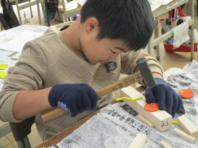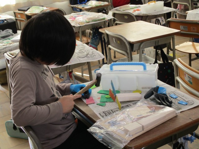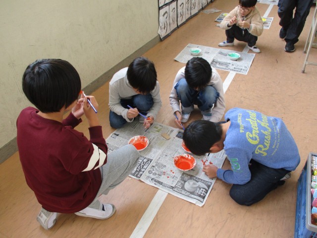 はじめにどのように形を作っていくのか決めてから木片に色を塗りました。