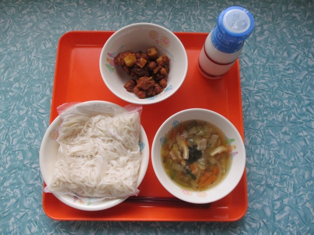 今日の給食は、ソフトめん・牛乳・鶏肉とれんこんの黒糖がらめ・五目ソフトめん(汁)です。