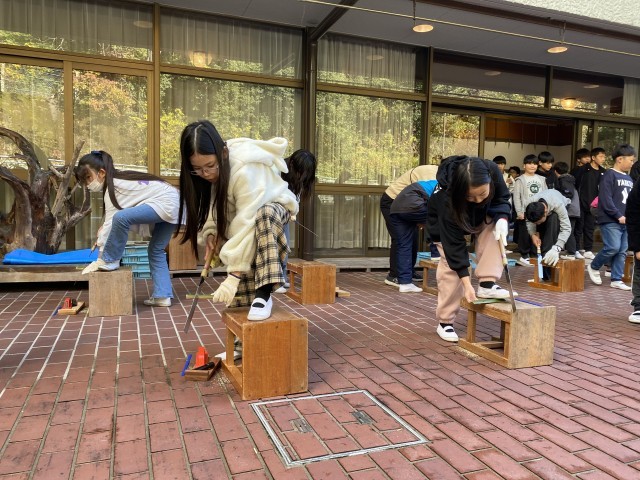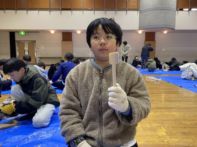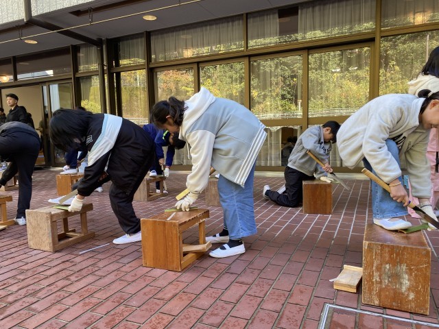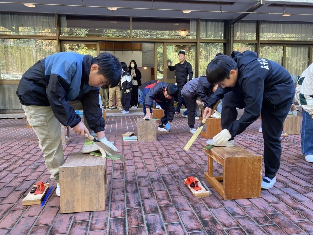 のこぎりや小刀、なたを使って、丁寧に仕上げます。力と頭を使って安全に作業しています。