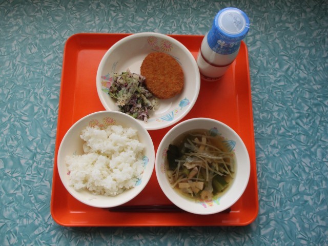 今日の給食は、ご飯・牛乳・コロッケ・赤じそ和え・沢煮わんです。