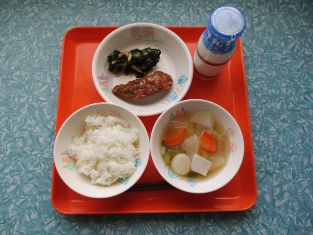 今日の給食は、ご飯・牛乳・さばの竜田揚げ・小松菜の煮びたし・もち入りすまし汁です。