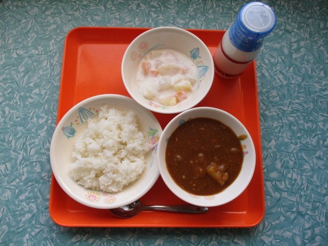 今日の給食は、ご飯・牛乳・シーフードカレー・フルーツヨーグルトです。