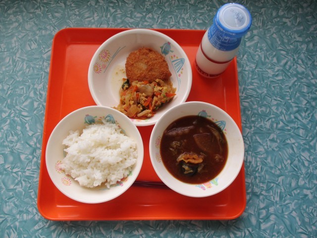今日の給食は、ご飯・牛乳・うきうきカツ丼(卵とじ・一口カツ)一宮のみそ汁です。