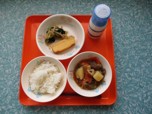 今日の給食は、ご飯・牛乳・厚焼きたまご・切干しだいこんの甘酢和え・肉じゃがです。