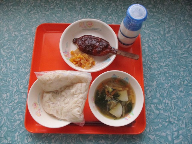 今日の給食は、きしめん・牛乳・五平餅・たまりしょうゆ和え・きしめん(汁)です。