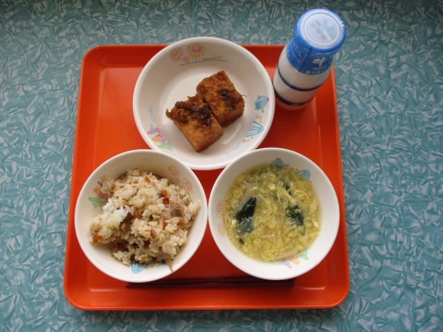 今日の給食は、かきまわし・牛乳・生揚げのねぎしょうがだれ・うきうきかきたま汁です。