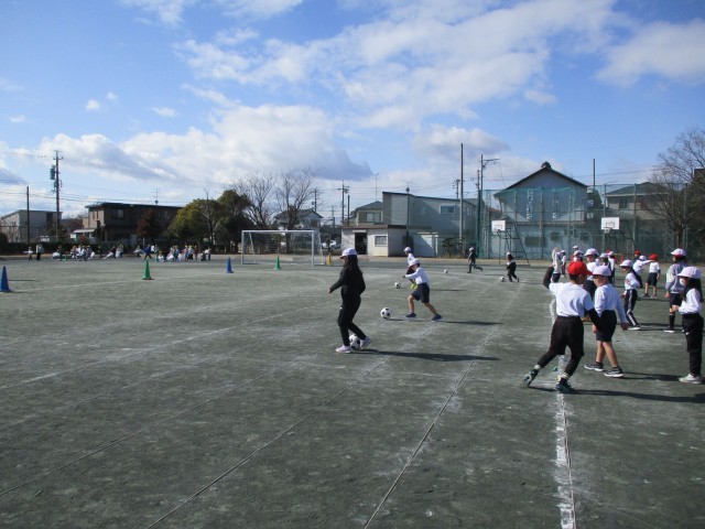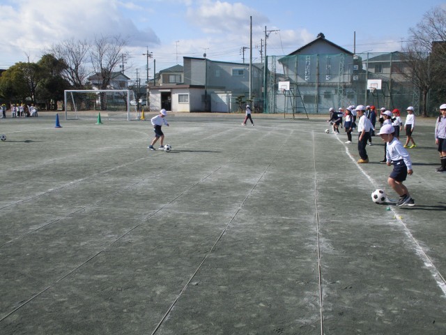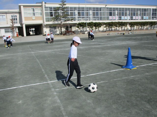 上手にドリブルをしてカラーコーンを回って次の人にボールを届けます。