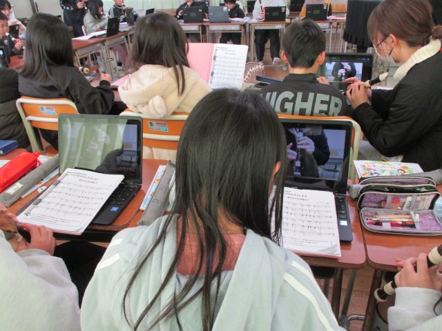 指使いのお手本動画をタブレットで見ながら、きれいな音で演奏できるようがんばっていました。