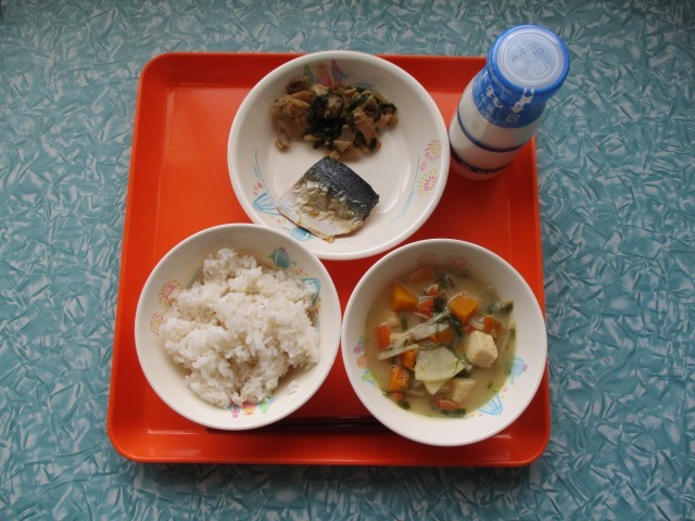 今日の給食は、麦ご飯・牛乳・さばの塩焼き・れんこんとかぶのいため物・根菜のかす汁です。