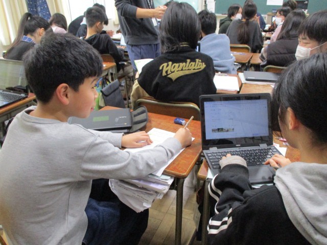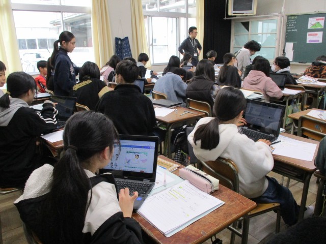 教科書や自分で見つけた資料も活用しながら、自分のしたいことを英語で表現できるようがんばっていました。