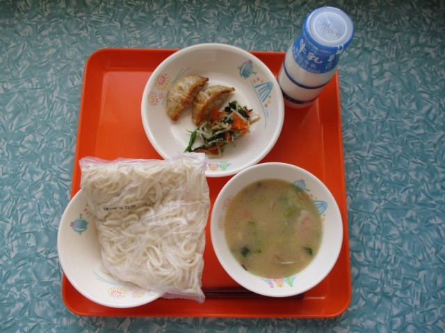今日の給食は、ソフトめん・牛乳・焼きぎょうざ・カラフルナムル・海鮮ちゃんぽん(汁)です。