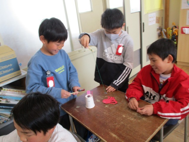いままで学習してきたことのまとめとして、実験に使った物を活用して楽しく遊べるおもちゃを作りました。