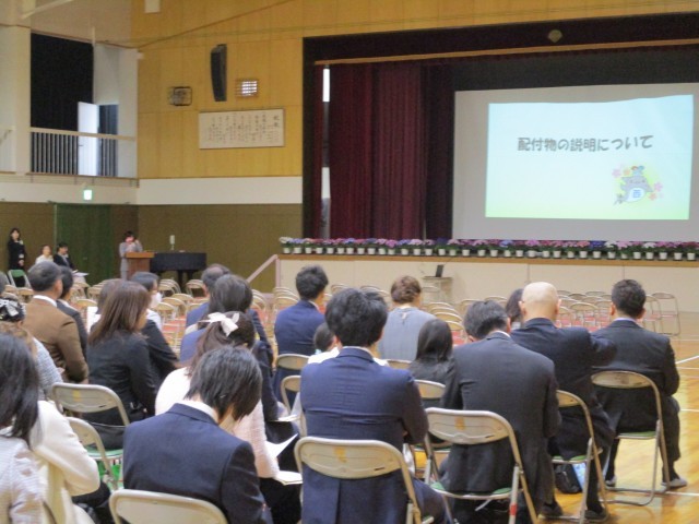 入学式の後、保護者の皆さんは体育館で今後の予定や配布物などの説明を聞いていただきました。