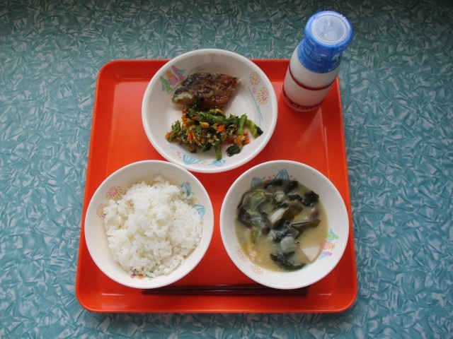 今日の給食は、ご飯・牛乳・さわらのあんかけ・菜花とささみのいためもの・春キャベツのみそ汁です。