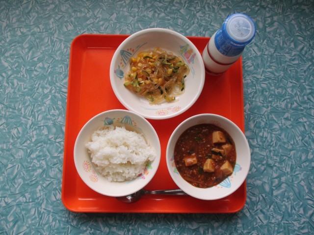 今日の給食は、ご飯・牛乳・マーボードウフ・バンサンスーです。