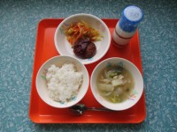 今日の給食は、ご飯・牛乳・厚焼きたまご・磯か和え・肉じゃがです。