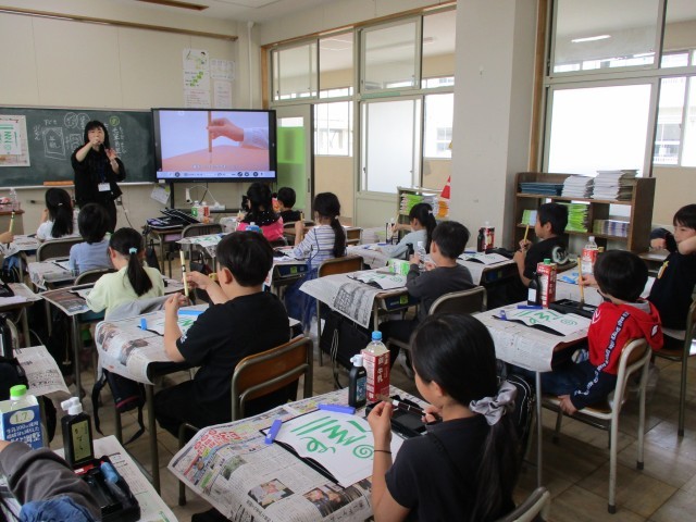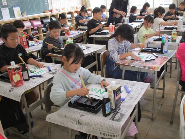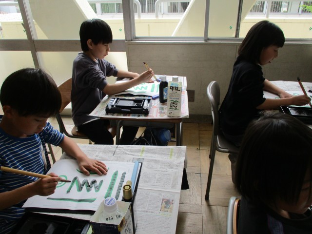 筆の持ち方を確かめてから、さっそく墨をつけて線を引いてみました。