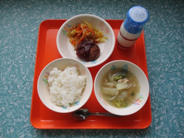 ご飯・牛乳・ハンバーグのケチャップソース・キャベツソテー・ABCマカロニスープです。