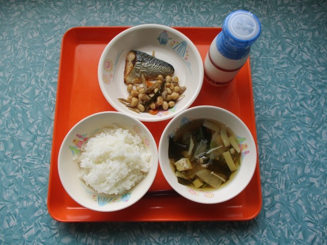 今日の給食は、ご飯・牛乳・五目煮豆・若竹汁です。