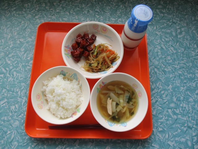 今日の給食は、ご飯・牛乳・生揚げのヤンニョム・チャプチェ・中華スープです。