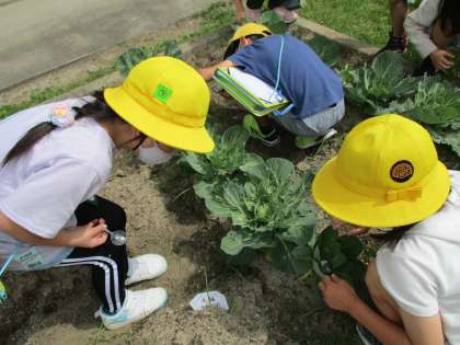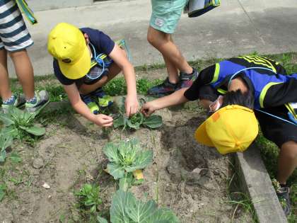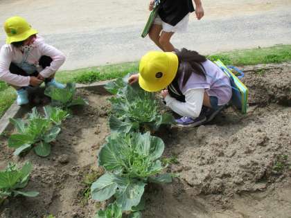 花壇のキャベツ畑でモンシロチョウの卵を探しました。