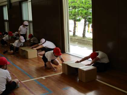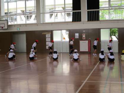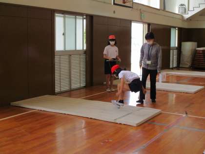 体育館では反復横跳び、立ち幅跳び、長座体前屈、上体起こしを行います。