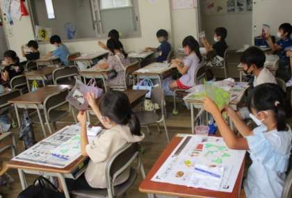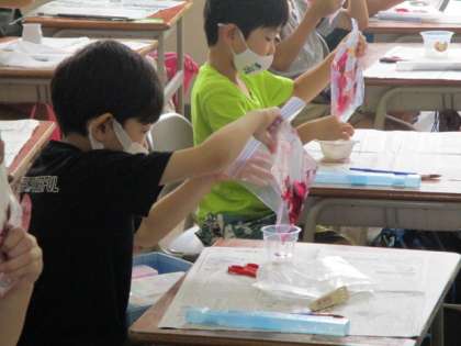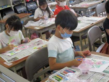 その後、色水を使ってあさがおの花の絵に色をつけました。