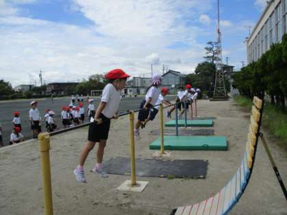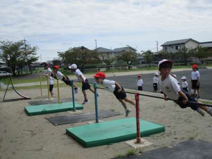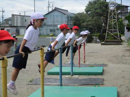 鉄棒をしっかりとにぎって体を支える技に挑戦しました。