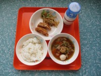 4・26 今日の給食 公開日 2024/04/26 更新日 2024/04/26 食育・給食 今日の給食はご飯・牛乳・あおさのみそ汁・魚とかぼちゃの揚げに・ごまあえです。 あおさは海藻の仲間で、ミネラルが豊富な食材です。給食に出るのは珍しい食材です。今日はみそ汁に入れました。風味を感じてもらえればと思います。