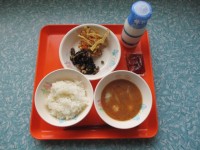 今日の給食は、ご飯・牛乳・米粉のとり天・こんぶ和え・かぼちゃの白みそ汁です。