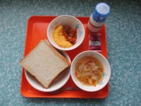 今日の給食は、スライスパン・牛乳・オムレツ・野菜のトマト煮・コンソメスープ・大豆...