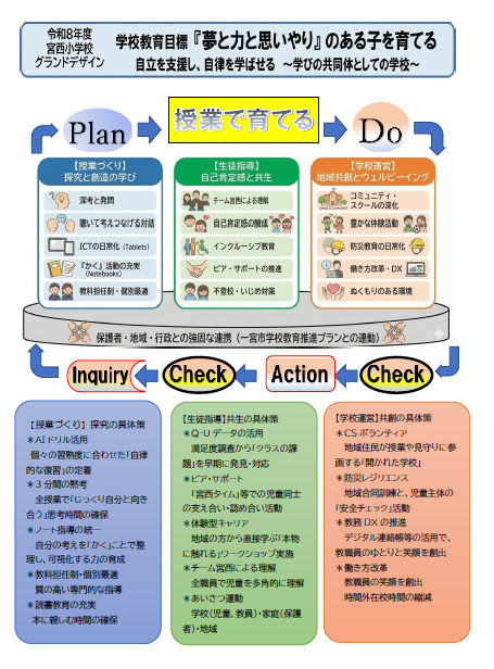 全職員が「チーム宮西」という意識のもと、【めざす児童像】の実現に努めることで自立的に生きる基礎を培う。