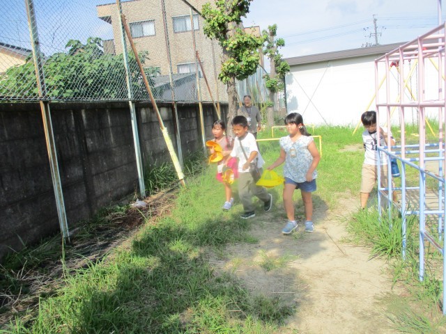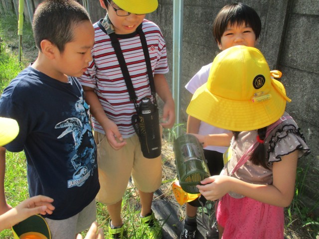 運動場の草むらで、虫さがしをしました。元気よく飛ぶバッタをよく狙って捕まえました。3年生は、理科のノートに記録をしました。せい虫の体は、頭・むね・はらの3つの部分からできていることを確認することができました。