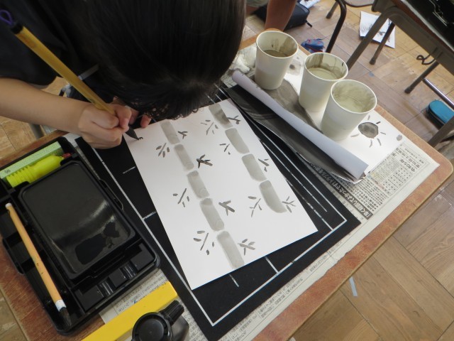 墨の濃淡やにじみ、かすれなどを生かしながら、筆を思い思いに動かして描きました。