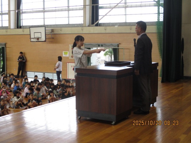 今日は任命式がありました。任命された人は大きな声で返事をし、任命式に臨むことができました。後期児童会、後期代議員、後期学級委員などを中心にこれからの行事なども成功できるよう協力していきます。