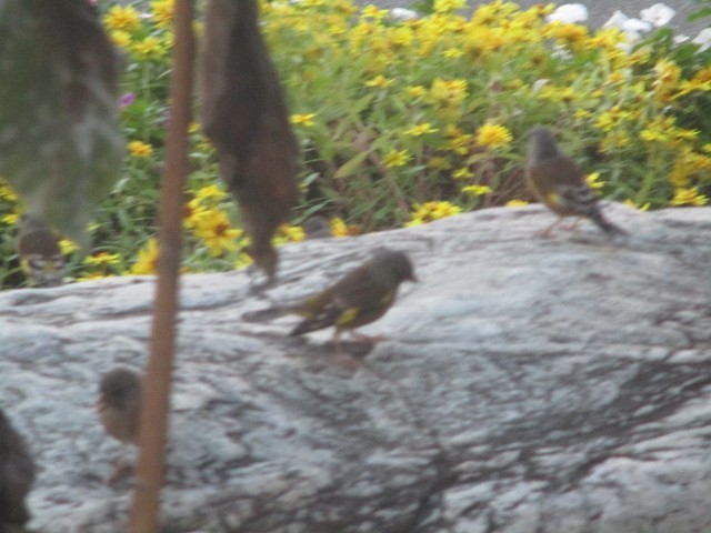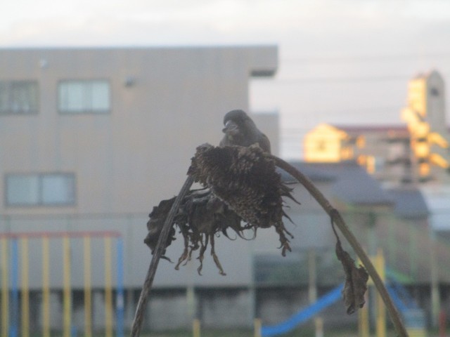 学校の花壇に植えてあるヒマワリの花もすっかり枯れてしまいましたが、朝になると、そのヒマワリの種を求めて野鳥たちが集まってきます。写真は「カワラヒワ」という野鳥です。
