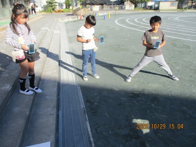 3年生の理科で光の性質について学習しています。今日は、地面の近くに鏡を置き、光の進み方や光を重ねたときの明るさについて調べました。