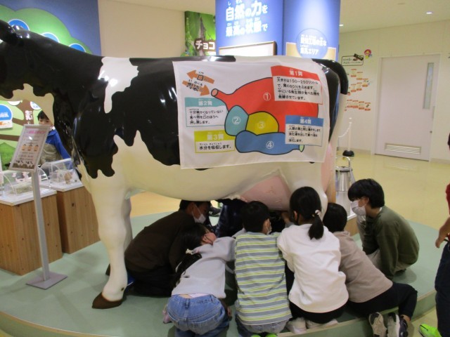 明治なるほどファクトリーでは、乳しぼり体験や工場見学をしました。