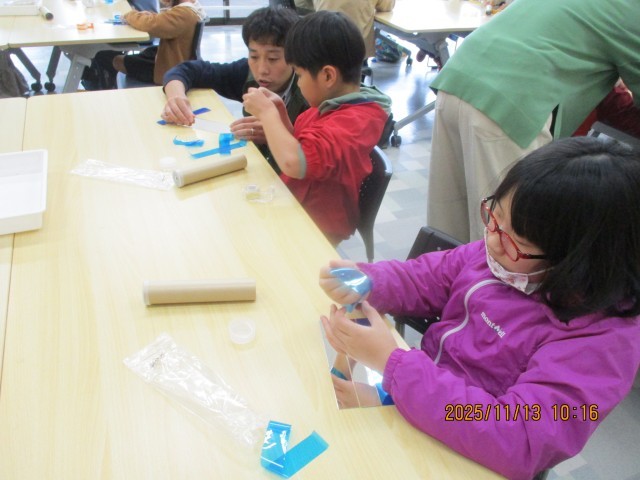 河川環境楽園内にある自然発見館で「しぜんのまんげきょう」のプログラムに参加させていただきました。万華鏡の中の鏡をていねいに貼り付けた後、外へ出かけて中に入れる落ち葉や花びらなどを探して入れました。覗いてみると素敵な模様が表れました!スタッフのみなさん、楽しいプログラムをありがとうございました。