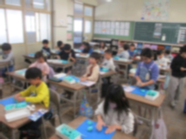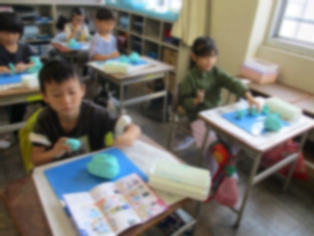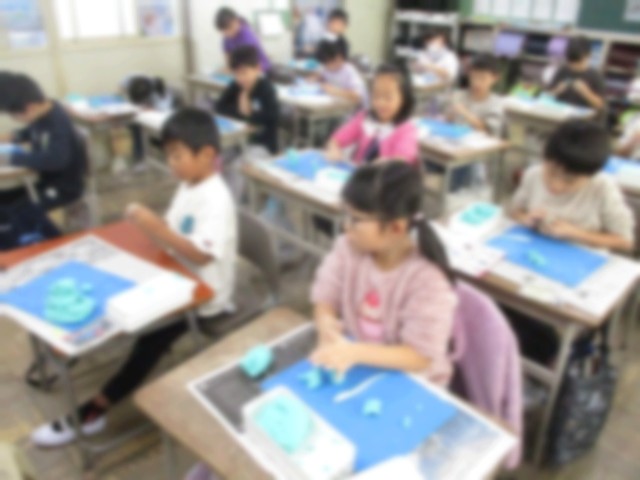 図画工作の授業で、楽しかった校外学習の思い出をねん土で表現しました。楽しかった思い出がつまったすてきな作品が出来上がりました。