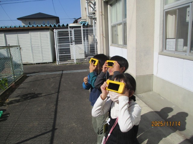 今日3時間目の理科の時間に、遮光板を使って太陽を見ました。初めて見る太陽に